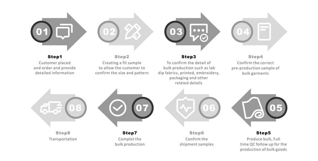 A powerful and orderly production line is the basic guarantee of our company. We have established large-scale production bases in Jiangxi, Anhui, Henan, Zhejiang, and other regions. We have more than 30 long-term cooperative factories, 10,000+ skilled workers, and 100+ production lines. We produce various types of knitted and thin-woven garments and have factory certification from WARP, BSCI, Sedex, and Disney.