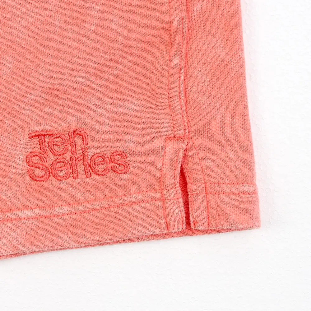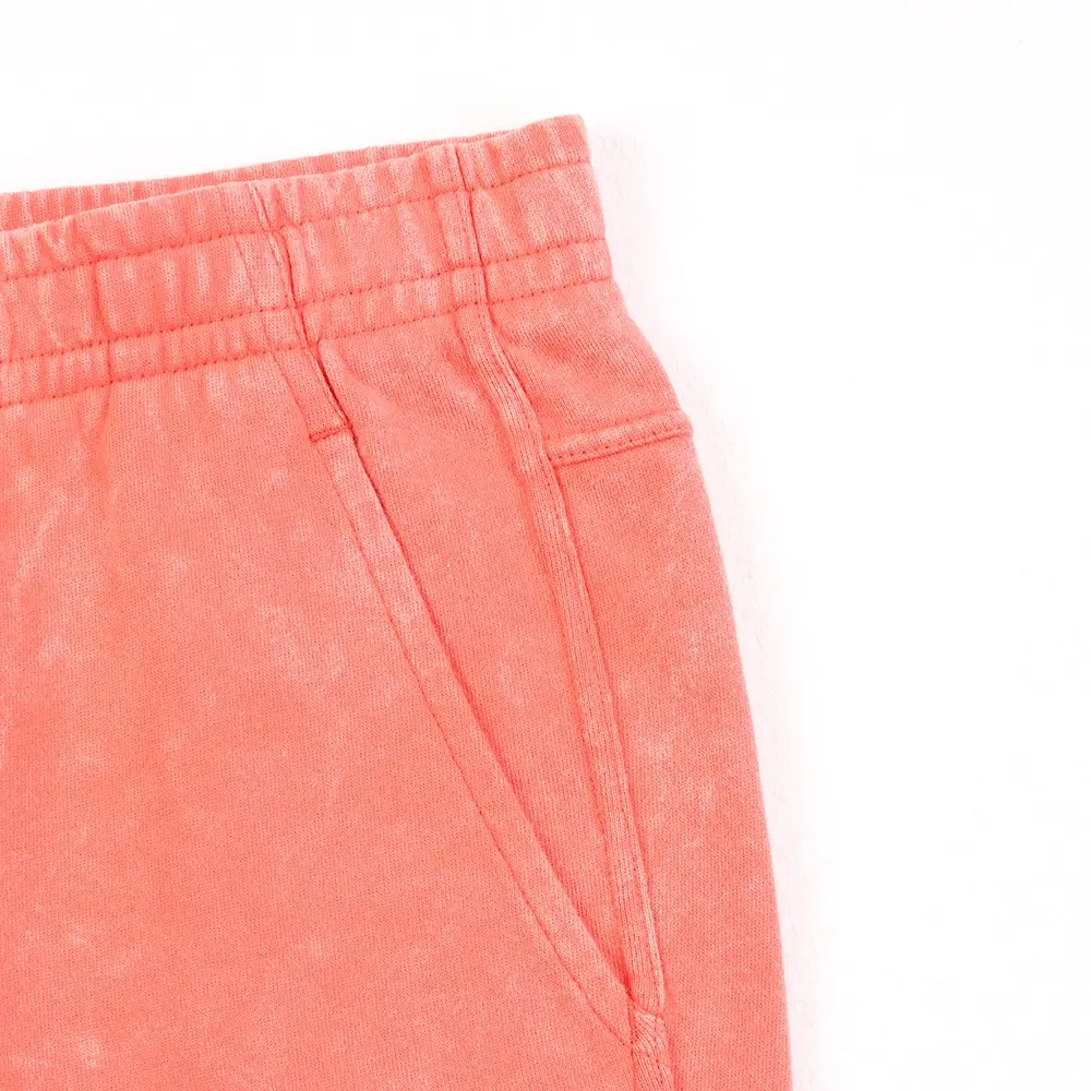 This men’s casual shorts are made of 100% pure cotton french terry fabric. Compared to shorts made of other blended fabrics, pure cotton shorts maintain good breathability and skin-friendliness, ensuring comfort even in hot summer weather. The garment is treated with a snow-wash technique, which is one of the processes involved in the garment’s washing treatment. This technique gives the fabric a softer touch and a slightly worn-out appearance. Due to the combination of the washing process and the cotton texture, the shorts have been well-controlled in terms of shrinkage, making them more durable and resistant to pilling. The waistband is elasticized with a stretchy rubber band, providing a snug and comfortable fit. The shorts also feature side pockets, adding both decorative elements and practicality for carrying small items. The bottom hem is designed with a split, which not only adds a stylish touch but also enhances wearing comfort and visual appeal. The brand logo is embroidered at the hem of the shorts, highlighting the brand’s quality and creating a visually appealing effect, which greatly aids in brand promotion.