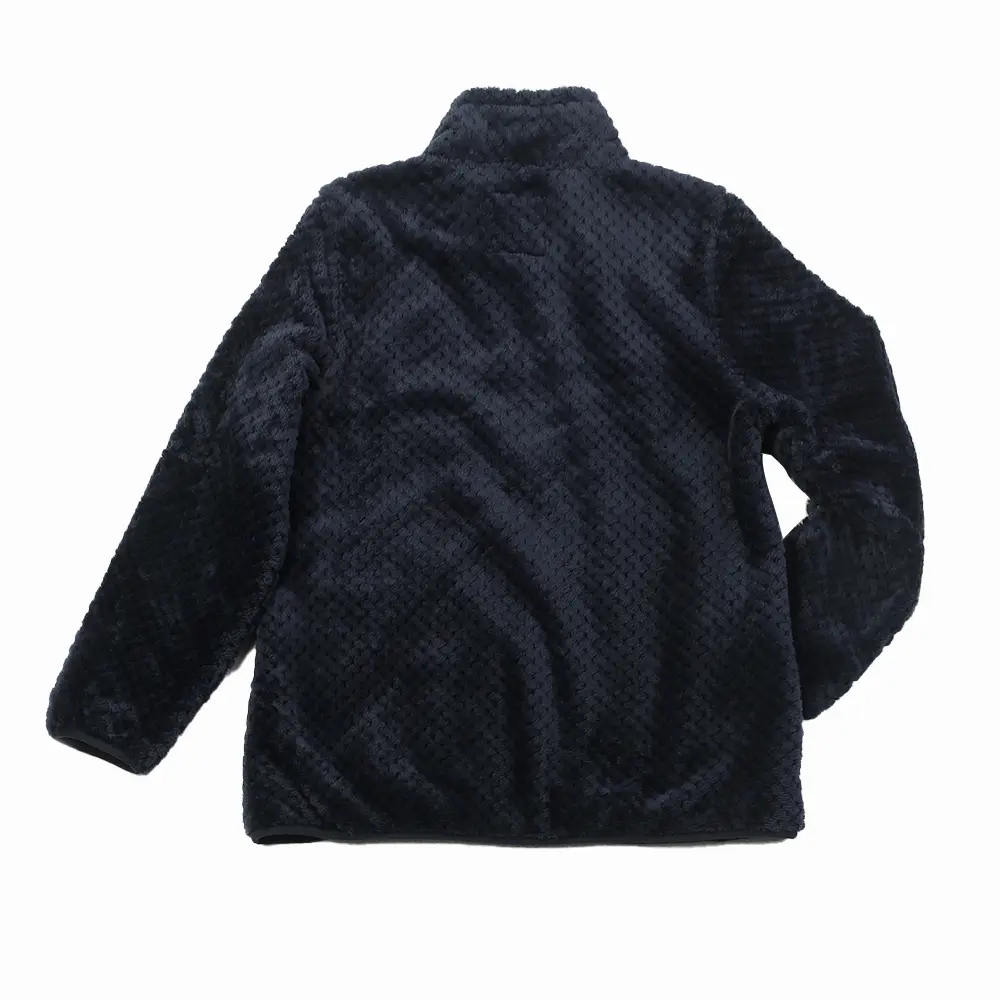 The fabric design introduces a waffle pattern style which is innovative, aesthetically pleasing, and offers a palpable texture. Complimenting this stylish design, the collar features a stand-up design, which compared to flat collared clothes, is more form-flattering. A stand-up collar elegantly outlines the curves of the neck and chin, invoking a more spirited and energetic aesthetic.
